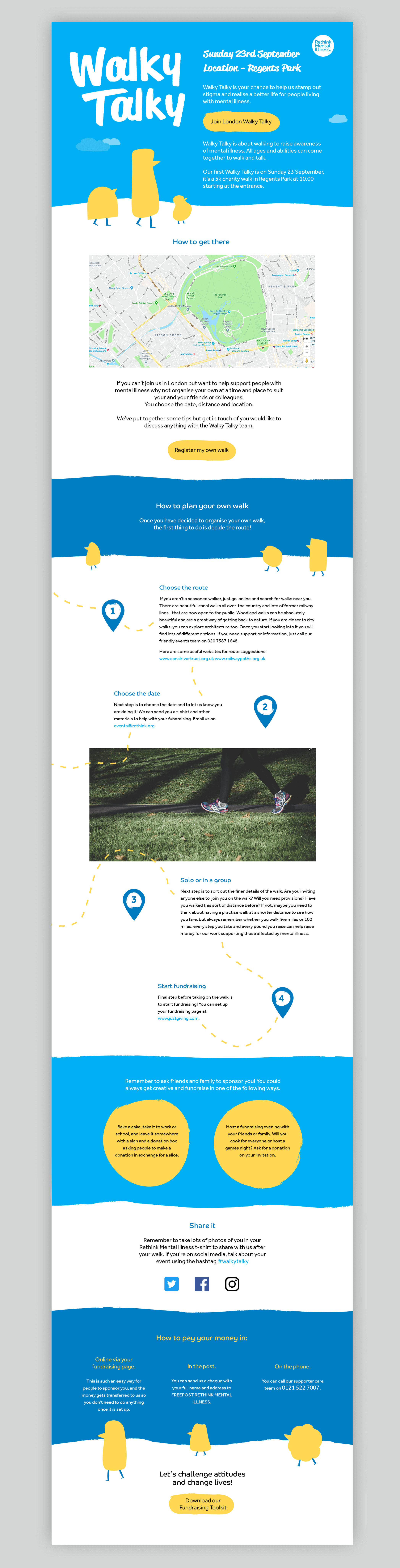 Web design for Rethink Mental Illness's Walky Talky campaign. Using pre-existing campaign assets I designed a responsive campaign website in collaboration with marketing and web site development professionals.